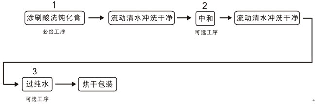 1.涂刷钝化膏,厚度为1-2MM,停留时间为1-20分钟,必经工序, 酸洗钝化完成的标准是看表面钝化膜是否完整,当工件表面******被亚白色所覆盖后表示钝化是合格的。